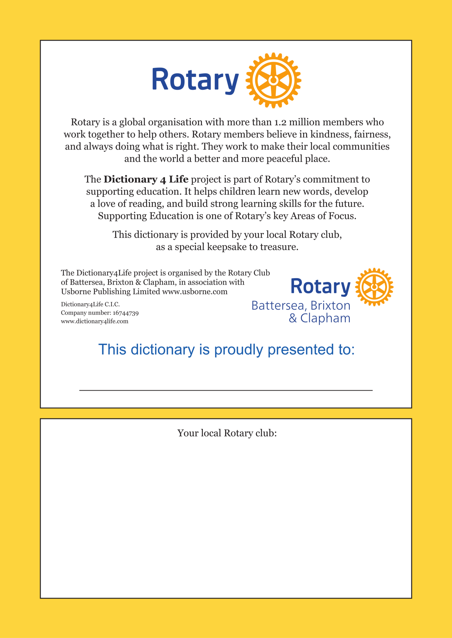 Rotary Club of *Your Name *Delivery Street Address *Apartment, suite, etc (optional)Town *Post Code *Phone (optional)Email Address *Number of cartons of 8 Dictionaries * Submit
